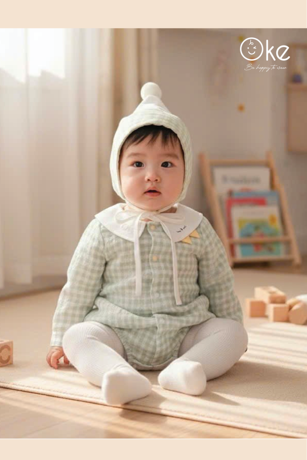 Set body dài tay xô muslin kẻ caro mix mũ buộc dây